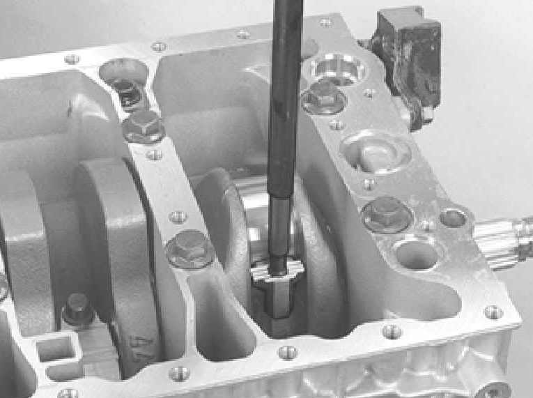 Install the two old screws for the flywheel/carrier plate at the rear edge of the crankshaft.