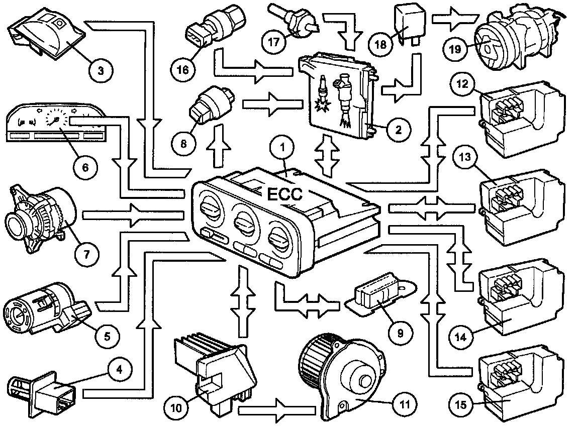 The A/C compressor is activated by the engine management system. The ECC control module requests activation using an A/C selected signal to the engine management system via the low-pressure switch (pressostat).