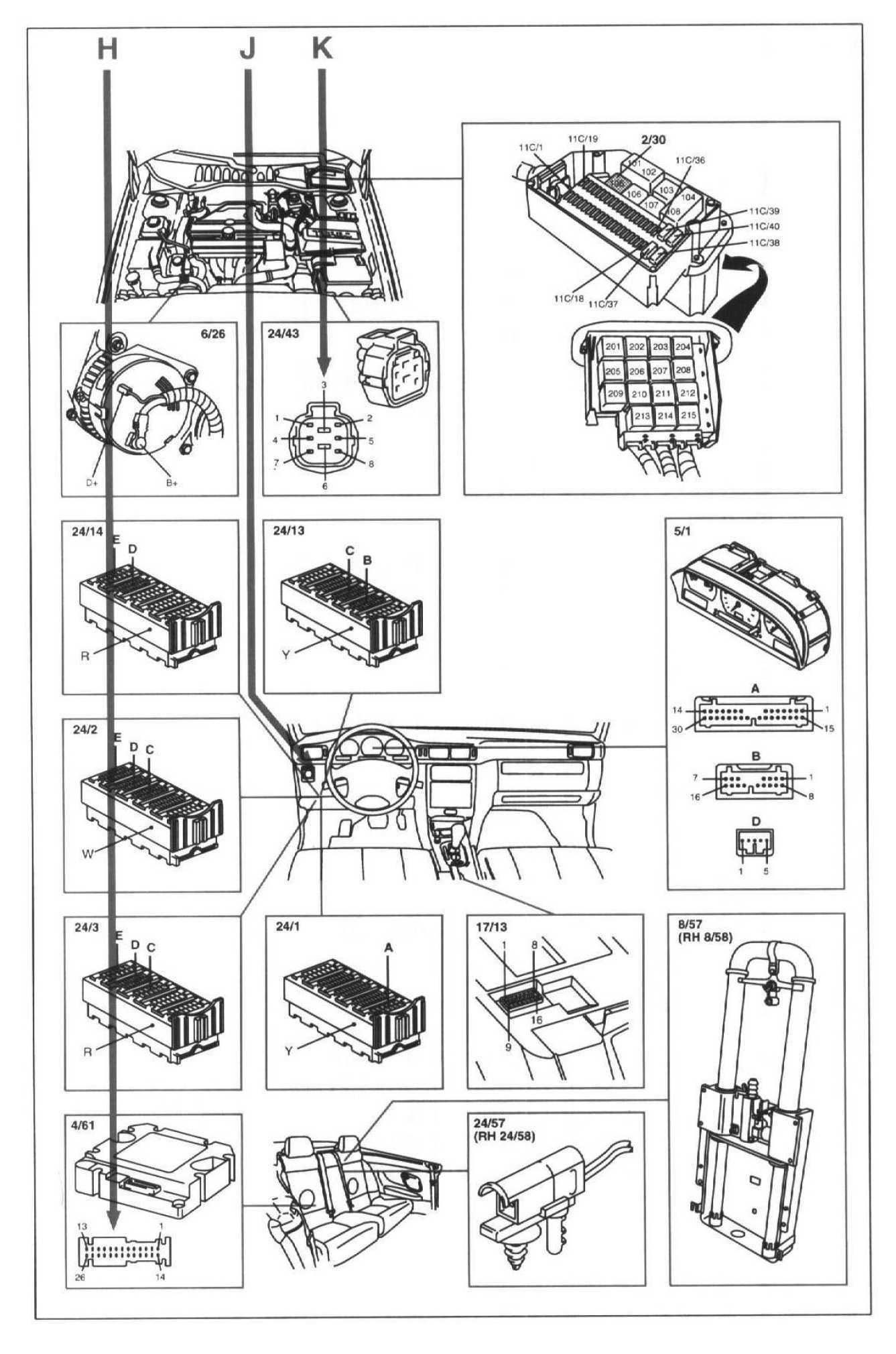 The junction points are numbered with a 23/xxx prefix. There is a list of the different junction points. It shows which other components the junctions points are joined to. The locations are shown in Locations, Harness, "Routing of cable harnesses in the car". Harness Locations