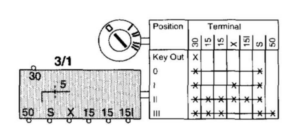 Example. In position III, terminal 30 is connected to terminals 15A, S, and 50.