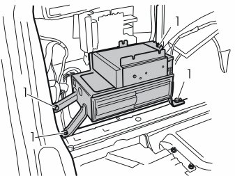 - Install the bracket with the DVD reader behind the wheel arch using the four screws (1) from the kit as illustrated. Tighten the screws. Tighten to 10 Nm (7 lbf. ft).