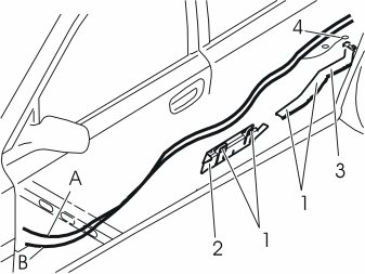 - Route the wiring (A and B) under the wiring at the cable duct (1). Continue out through the hole in the car body by the front edge of the wheel arch