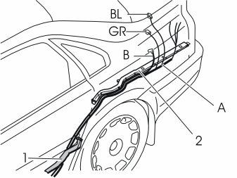 - Route the cable (3) with the blue connector. Position the cable at the tail lamp. The cable will be connected to the CD changer later.