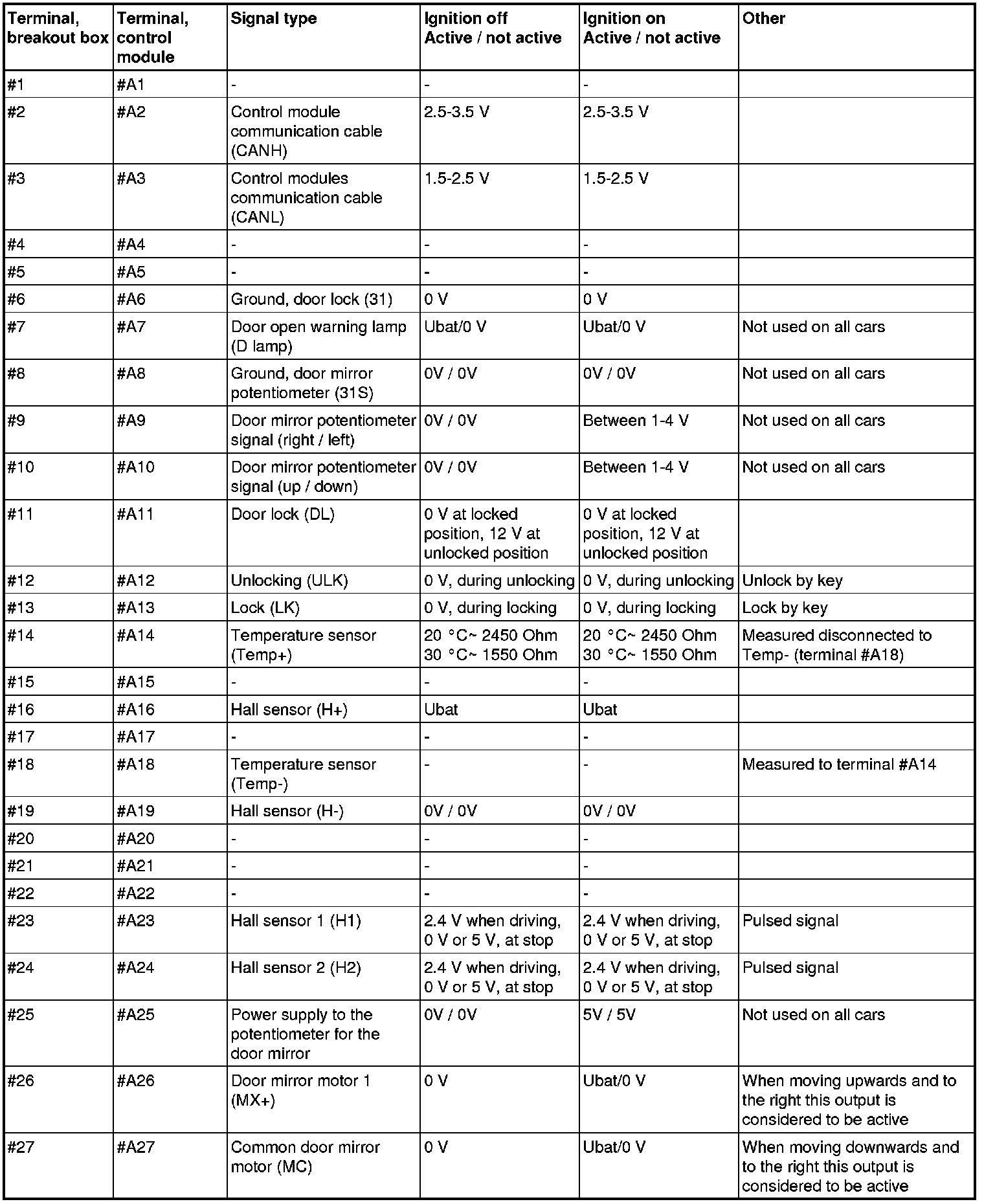 The following values are measured between the relevant terminal in column 1 and terminal #A6 (ground) unless otherwise stated.
