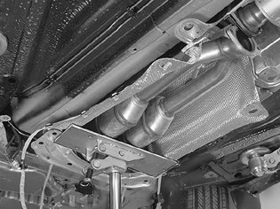 Position a mobile jack with universal plates 999 5972 FIXTURE 999 5972 Fixture under the catalytic converters.
