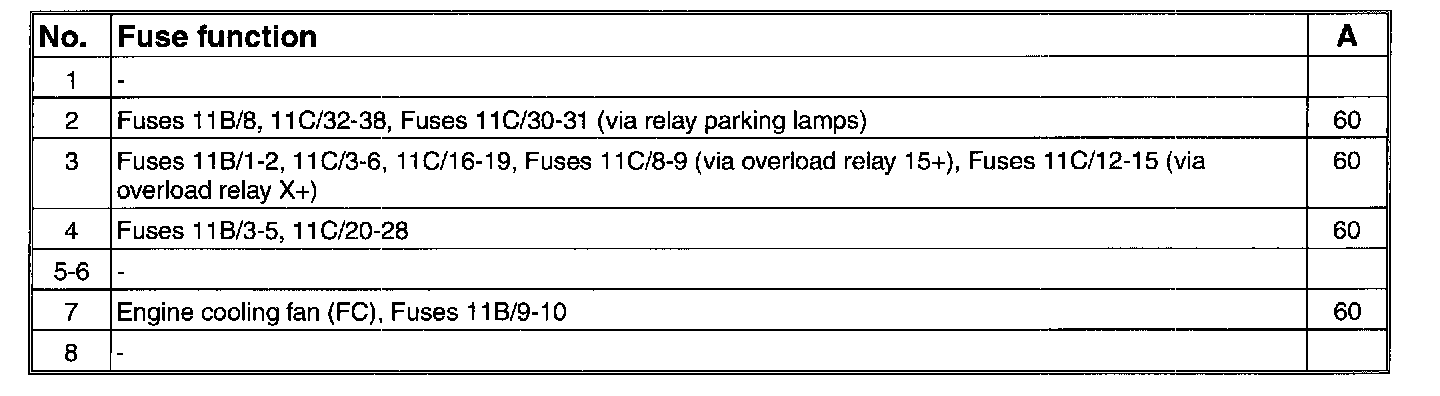 Main fuses, 11A/1-8, in the integrated relay/fusebox: