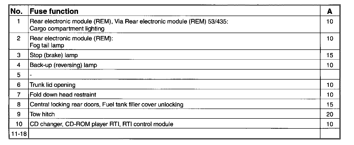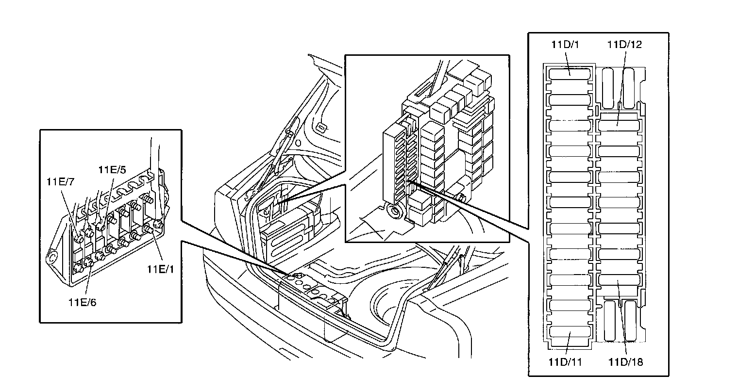 Fuses, 11D/1-18, in the integrated relay/fusebox: