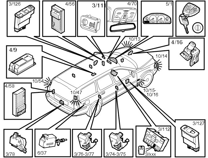 The number of switches, electrical motors in the door and relays, differs depending on the model year, version and type. The same control modules are used in different versions. The software differs on the type of lock, locking system and model. It is possible to shift between single step unlocking and two step unlocking by downloading new software.
