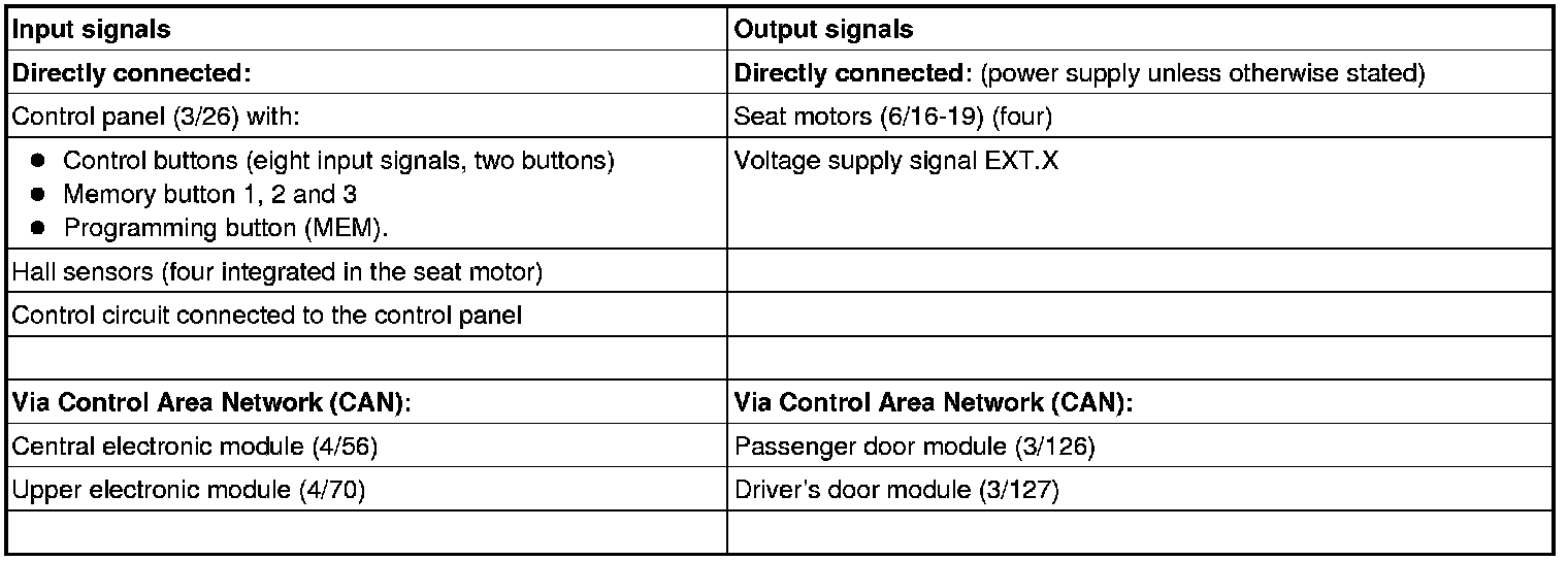 The table below summarizes input and output signals to and from the power seat module (4/52). The signal types are divided into directly connected signals, serial communication and Control area network (CAN) communication. The illustration below displays the same information with the Volvo part numbers.