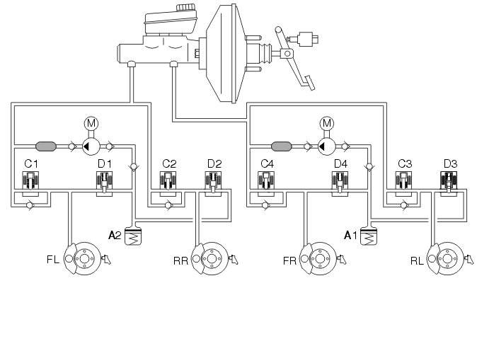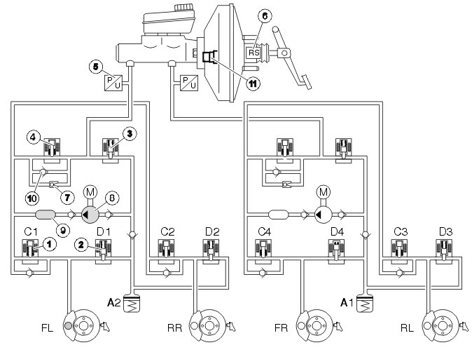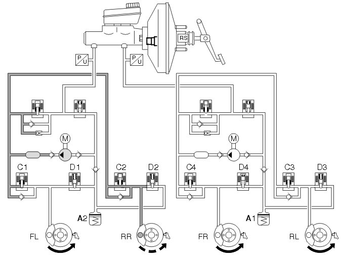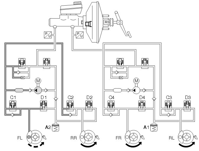 If the wheel locks anyway, the outlet valve opens and the brake fluid is allowed back to the accumulators resulting in a reduction in the brake circuit pressure (pressure release, see the left front wheel - FL). This reduces the hydraulic pressure and braking effect, allowing the wheel to accelerate. The hydraulic pump returns the brake fluid from the accumulators to the master cylinder.