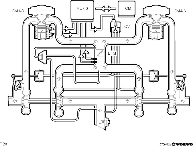 The Engine Control Module (ECM) constantly monitors boost pressure using the mass air flow (MAF) sensor and the intake air pressure sensor. If boost pressure exceeds permitted levels the Engine Control Module (ECM) shuts the turbocharger (TC) control valve so that the engine torque can only be controlled through limiting the throttle opening. A diagnostic trouble code (DTC) is stored at the same time.