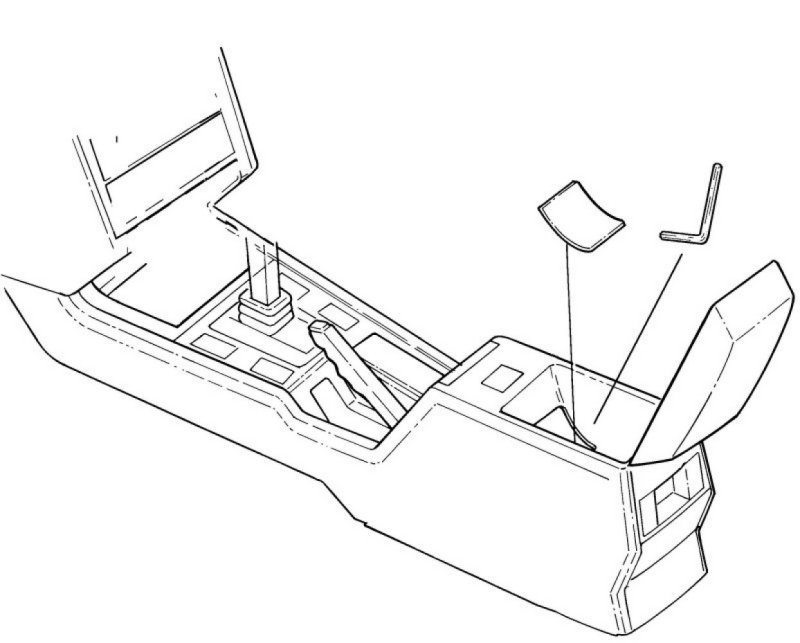 - Remove the square cover plate under the center console armrest to access the parking brake lever adjustment screw.