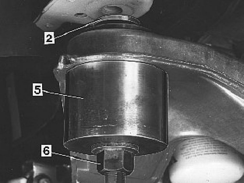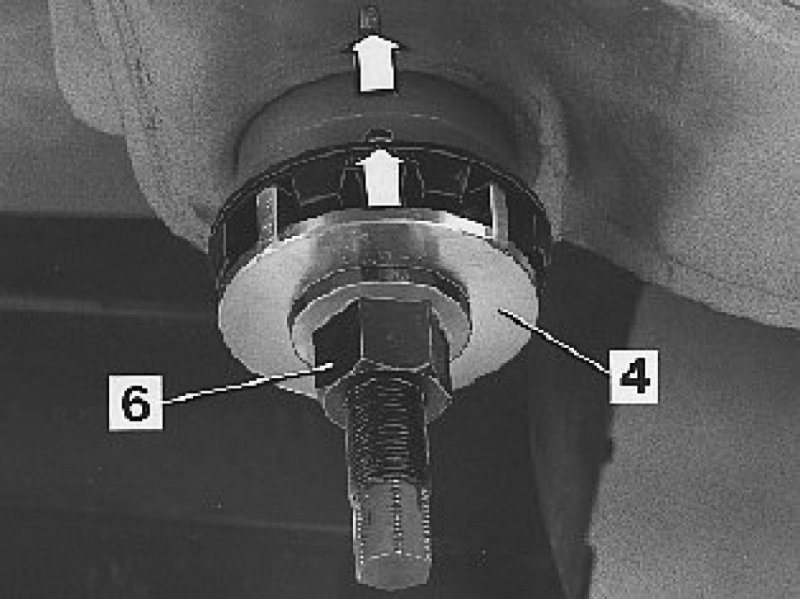 Apply the drift (4) with the spikes upwards and the bushing with the rubber spikes downwards on the screw with the nut (6).