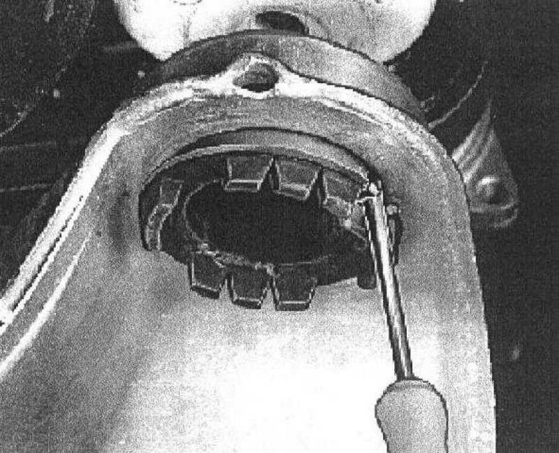 Apply the drift (4) with the spikes upwards and the bushing with the rubber spikes downwards on the screw with the nut (6).