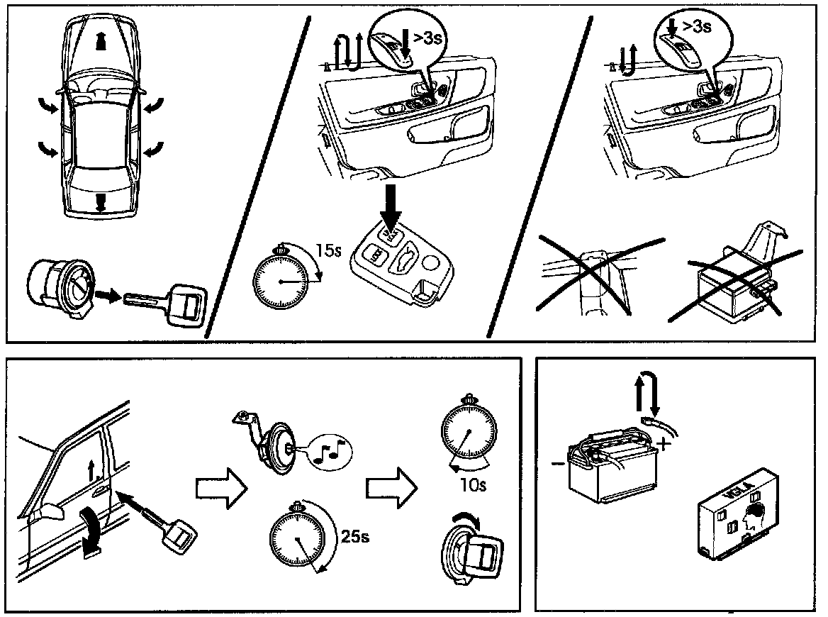 Press UNLOCK on the internal switch for the central locking 3 seconds. The car is first unlocked, after 3 seconds it is locked and then directly unlocked again.