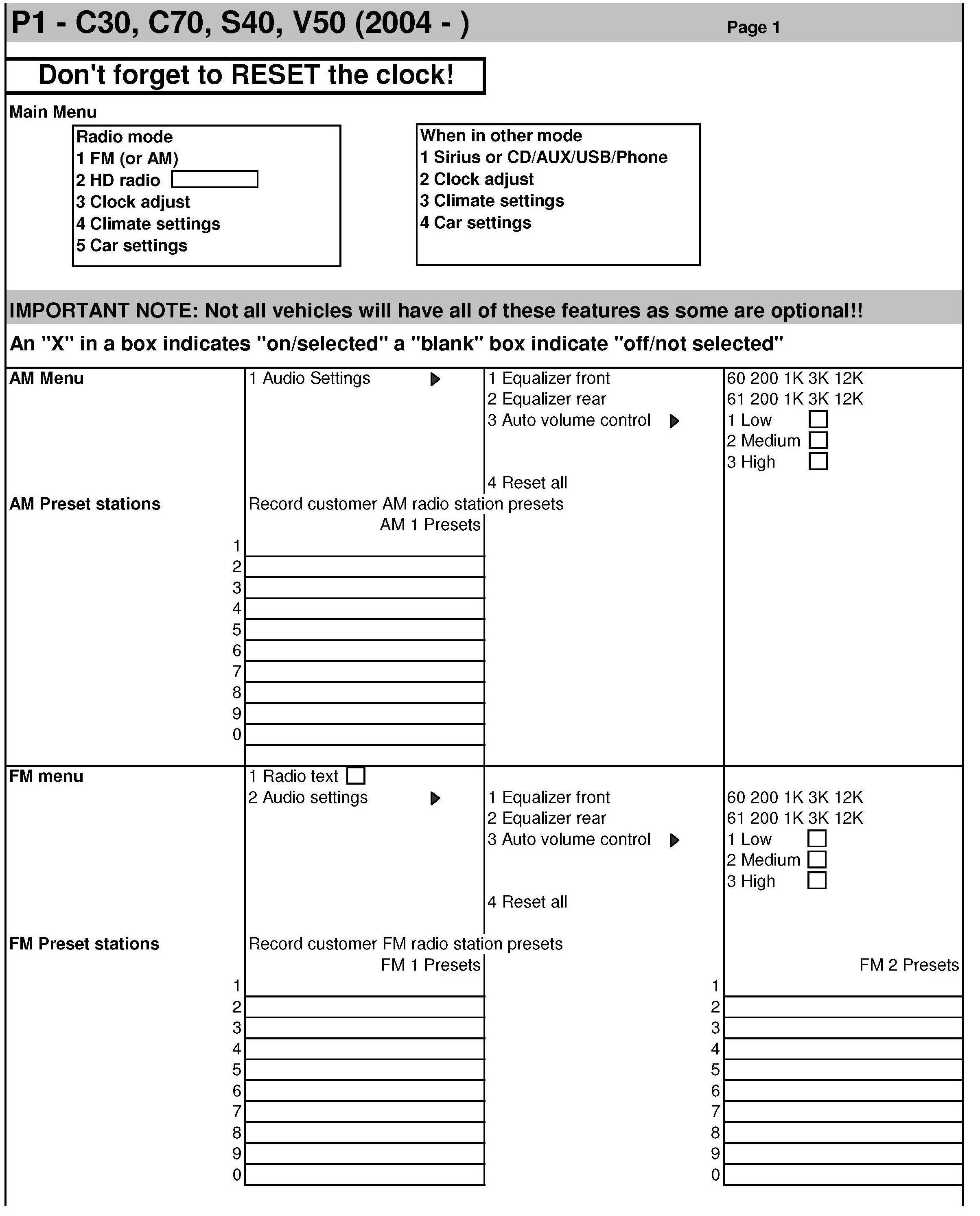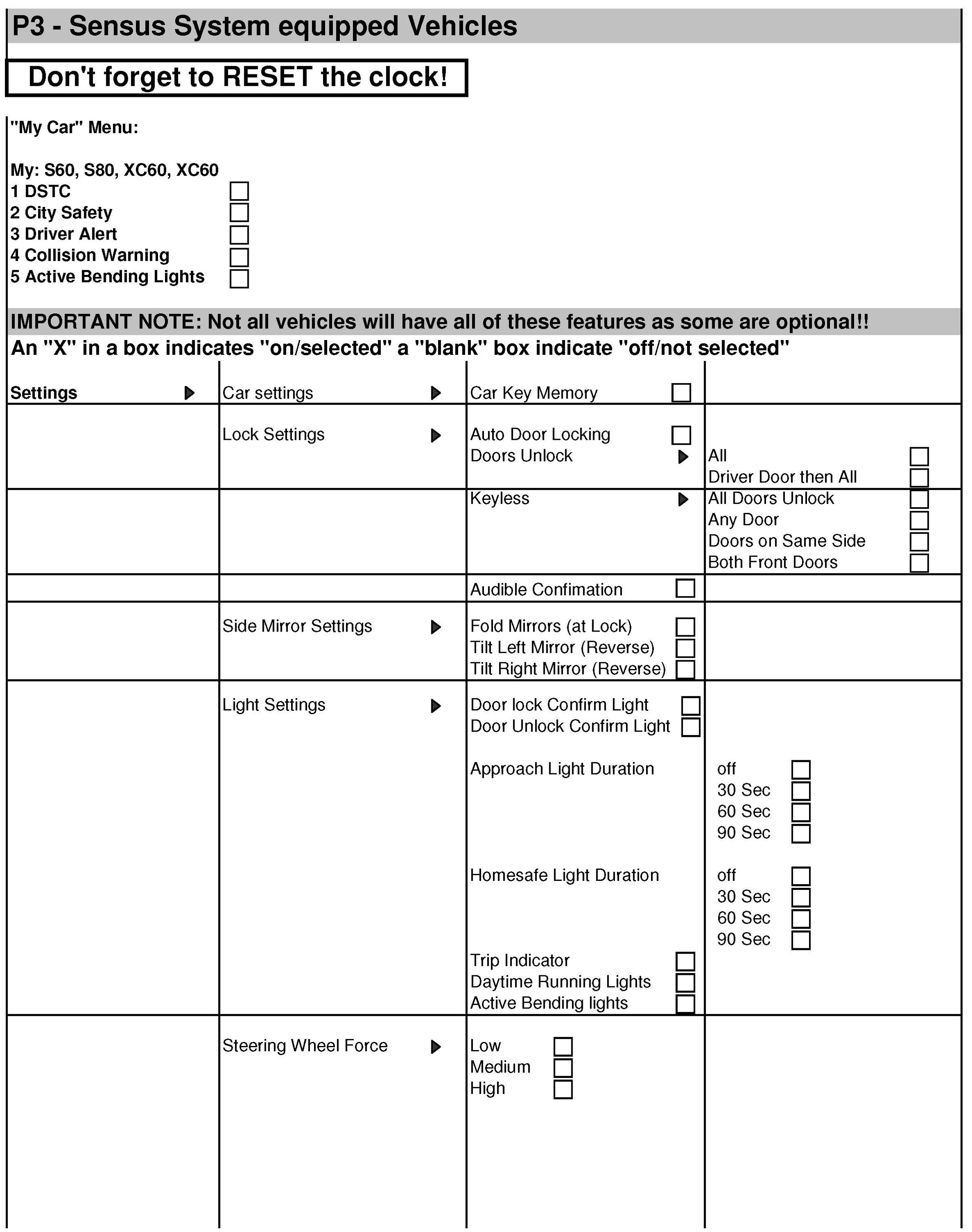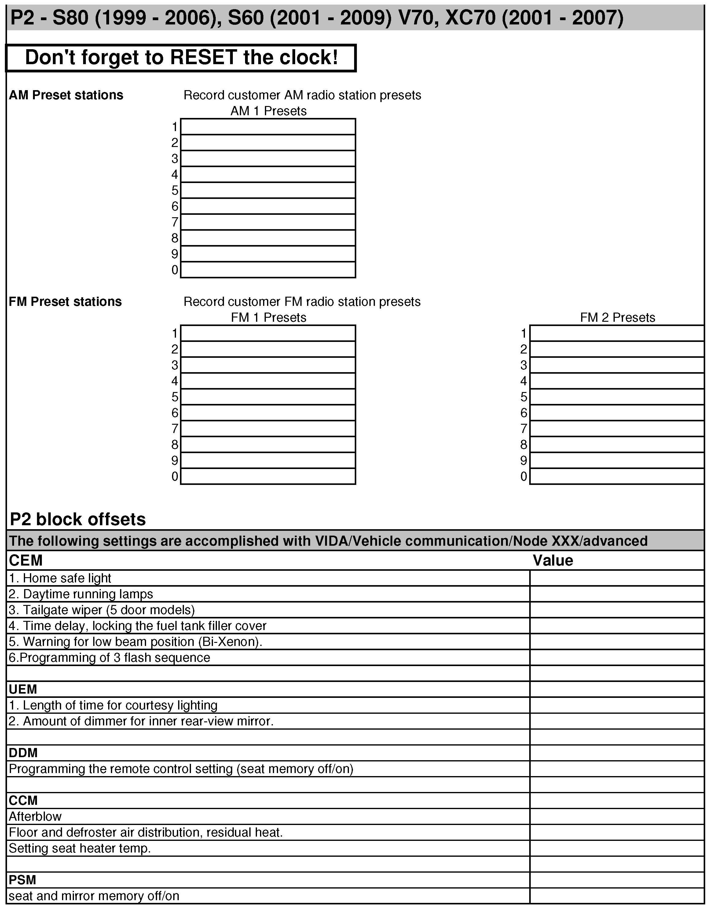 This bulletin includes the following forms for your use in recoding customer settings and resetting prior to scheduled pick up time.