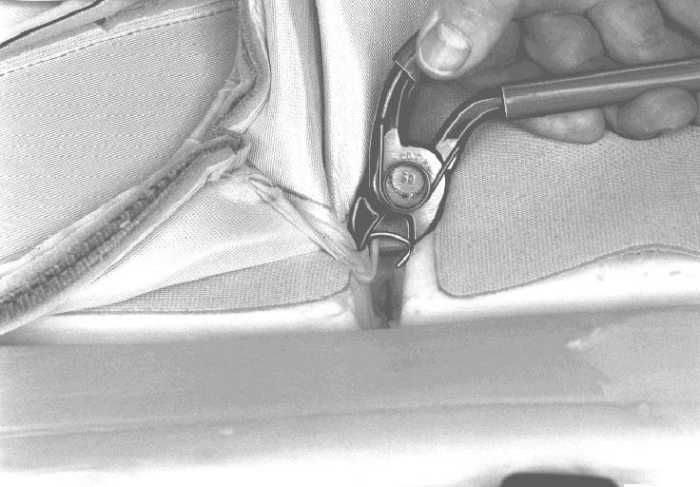 - Remove the upholstery to the first cross channel. Cut the two half moon clips on the long channel.