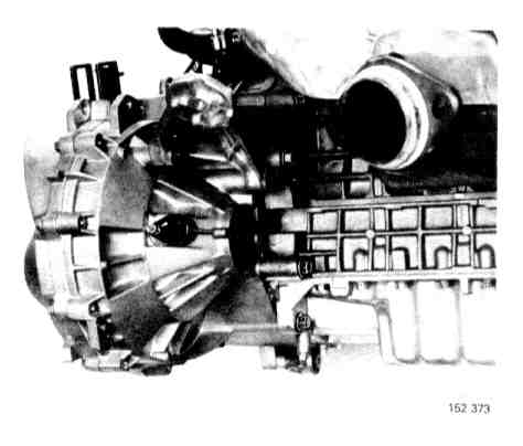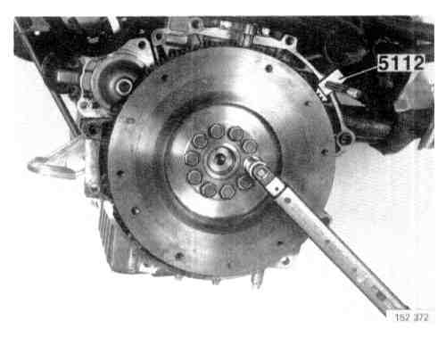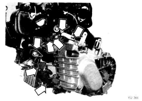 Remove 12 transmission screws from the engine at the flywheel mounting in the cylinder block.