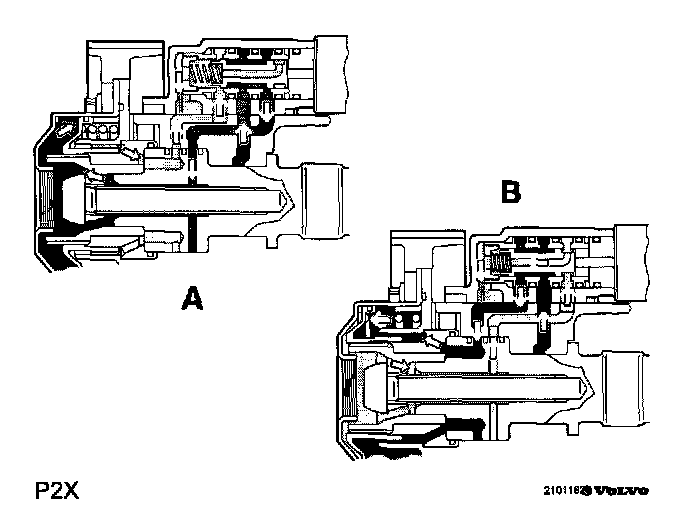 When the Continuous Variable Valve Timing valve receives the signal to move to the other outer position (B) the pressure is led from the piston housing center terminal to the front terminal. The return oil is then sent through the rear piston housing machining to the center of the piston, via the piston rear machining and the piston center channel to the Continuous Variable Valve Timing valve return terminal.