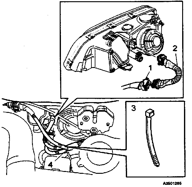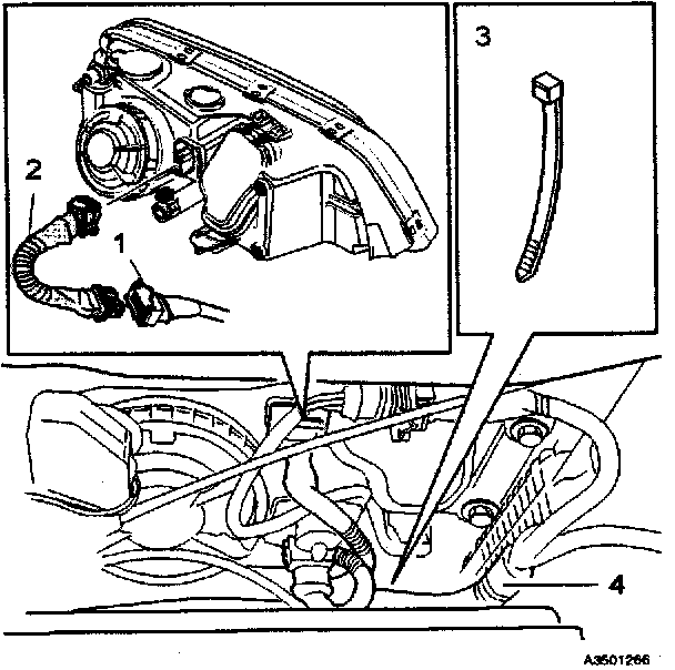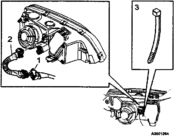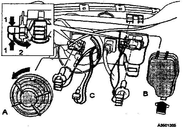 Press the wire catches on the retaining clamp (1 in inset illustration) together and push out (2) to release the bulb and connector from the headlight housing.