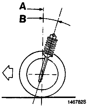 The caster angle (B) is the angle between vertical line (A) and a line which goes through the center of the lower ball joint and upper bearing (in other words a line through the spring strut) Caster encourages the wheel to travel straight forward and so makes steering easier. In addition the greater the caster angle the greater the self-centering effect.
