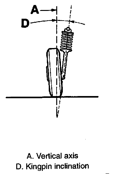 Originally king pin inclination (D) referred to king pin lean. Because the car does not have a king pin the inclination corresponds to the angle between the vertical line (A) and a line through the spring strut.