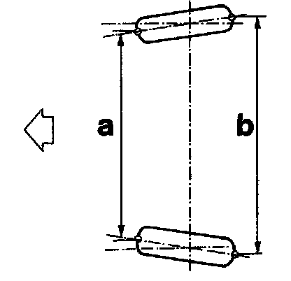 With toe-in the front part of the wheel points inwards. Toe-in can either be measured as an angle or as a difference between measurement a and b. See illustration.