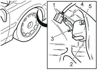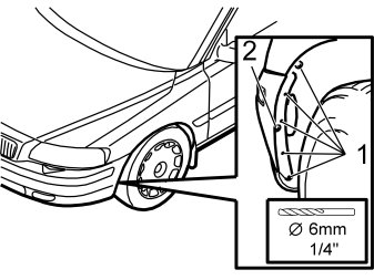 - Carefully drill out 4 of the 5 blind rivets (1) from the wing liner at the front edge of the wheel arch