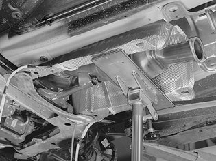 Position a mobile jack with universal plate 999 5972 FIXTURE 999 5972 Fixture under the catalytic converter.