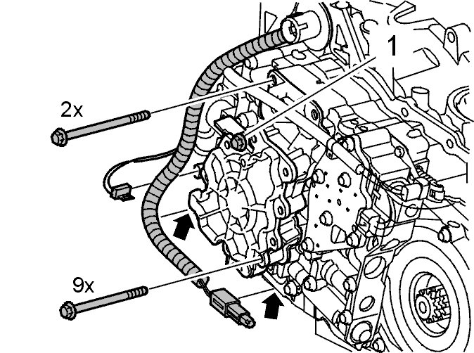 Note! In order to replace the lock-up solenoid, the oil pump must be removed from the control system. This is so that the spring clip holding the solenoid can be accessed. The shiny screw (1) must not be removed, it holds the oil pump together.
