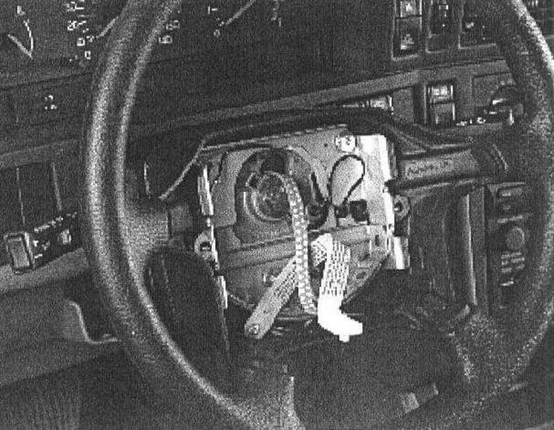 Disconnect the connector from the bracket located over the steering column. On left-hand drive cars, disconnect the right connector. On right-hand drive cars disconnect the left connector.