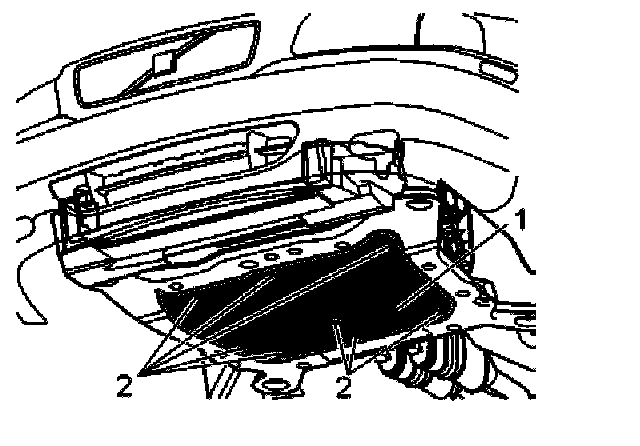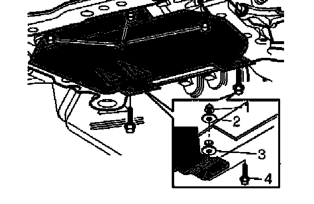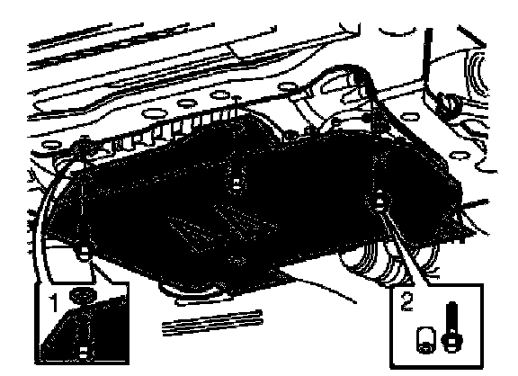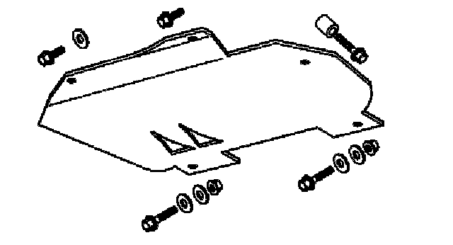 - Lift up the protective panel towards the subframe. Install the small screws in the front holes (1). Position all the washers between the sub frame and the protective panel in the right hole. Loosely screw the screws into place