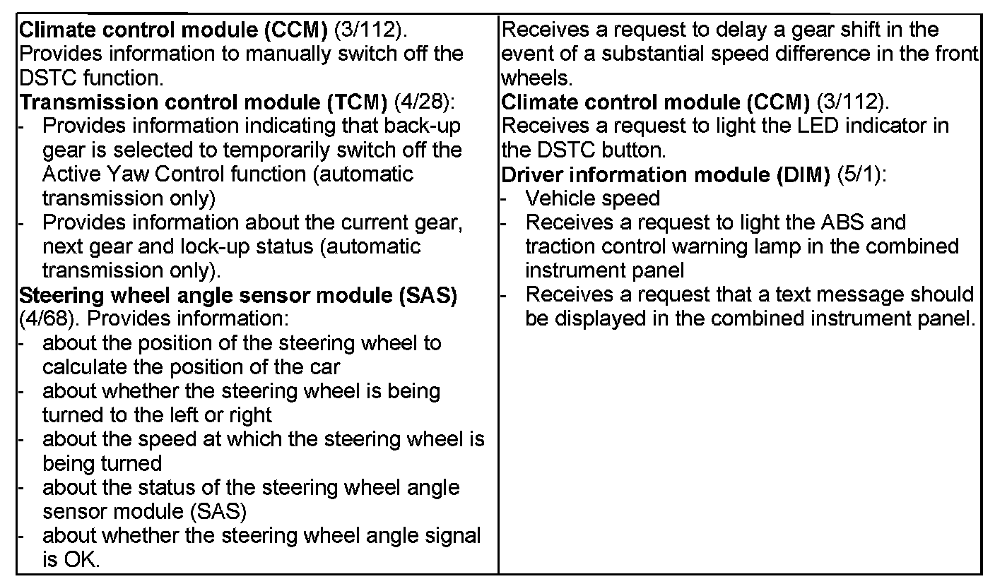 The control module checks calculations and all input and output signals via the built-in diagnostic functions. When the control module detects a fault certain functions are completely disengaged depending on the severity of the fault. At the same time a warning light comes on depending on the fault (see table). During manual disengagement of TRACS/STC/DSTC the control module stops all the functions except for the ABS, Electronic brake force distribution and vehicle speed signal. If the temperature of the brake discs is too high, certain functions are prevented from operating.