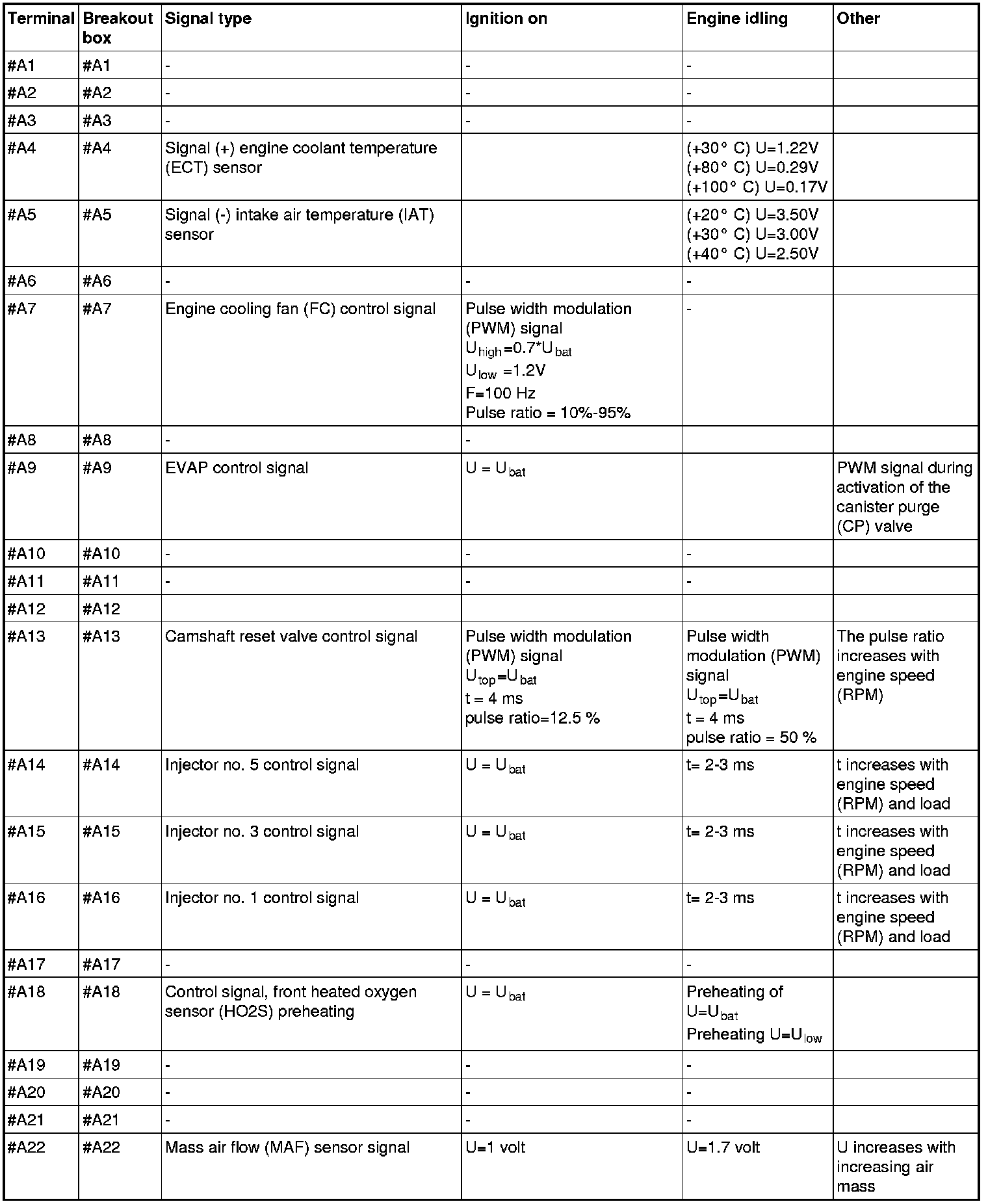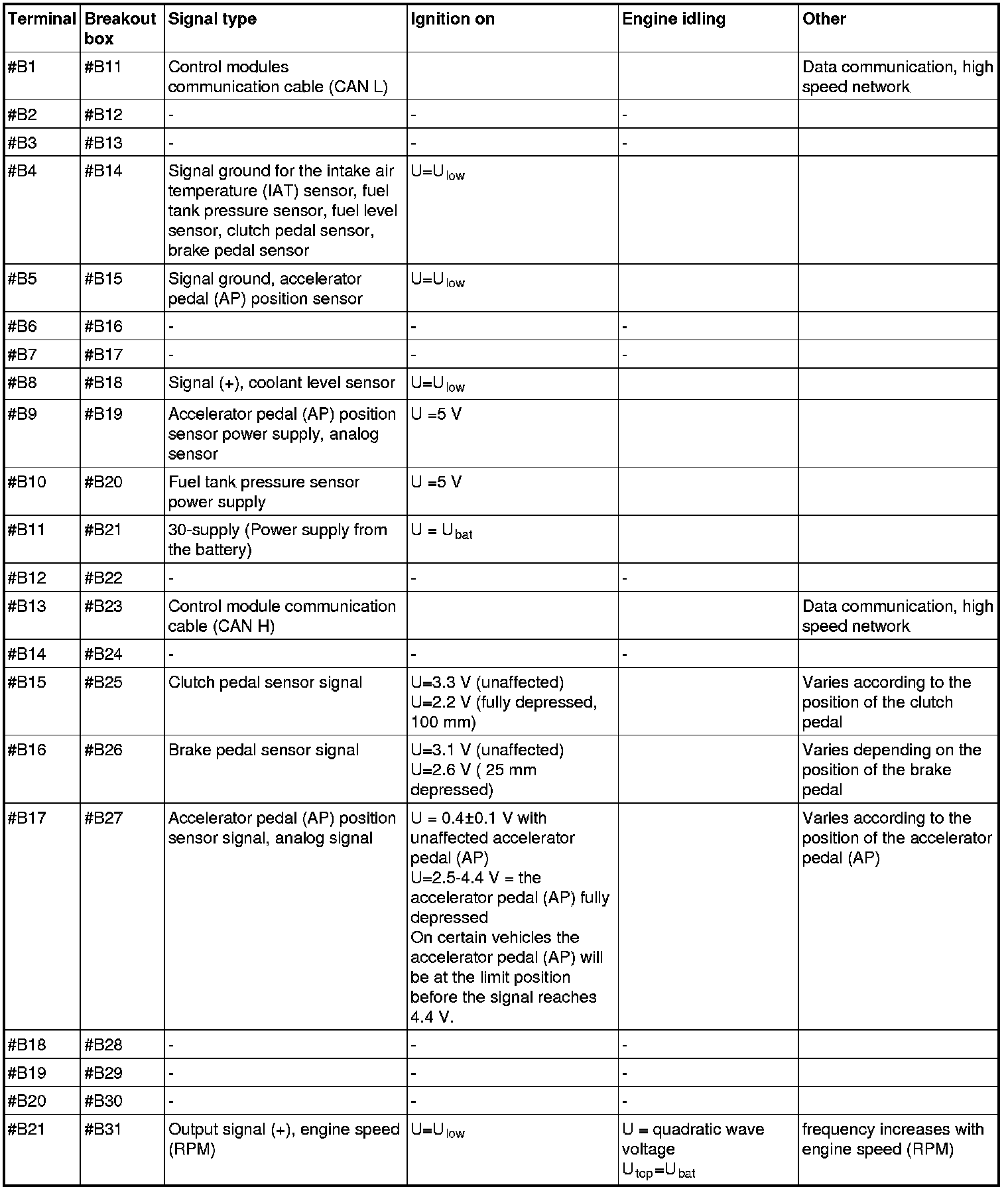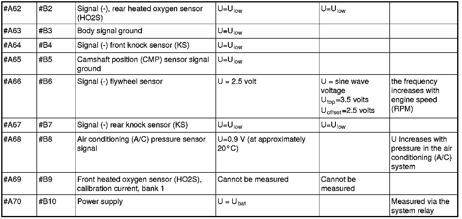 All the values given below are between the respective terminal in column 1 and terminal #B3 in column 2 (power ground) unless otherwise stated in brackets after the table entry. Control module terminals #A1-#A60 correspond to terminals #A1-#60 on the breakout box, terminals #A61-#A70 correspond to terminals #B1-#B10 on the breakout box and terminals #B1-#B50 correspond to terminals #B10-#B60 on the breakout box.
