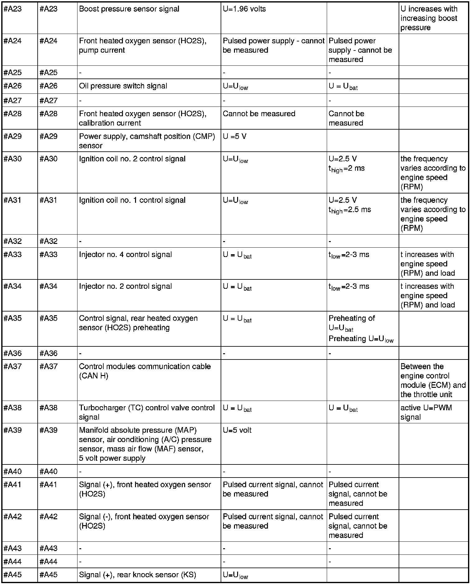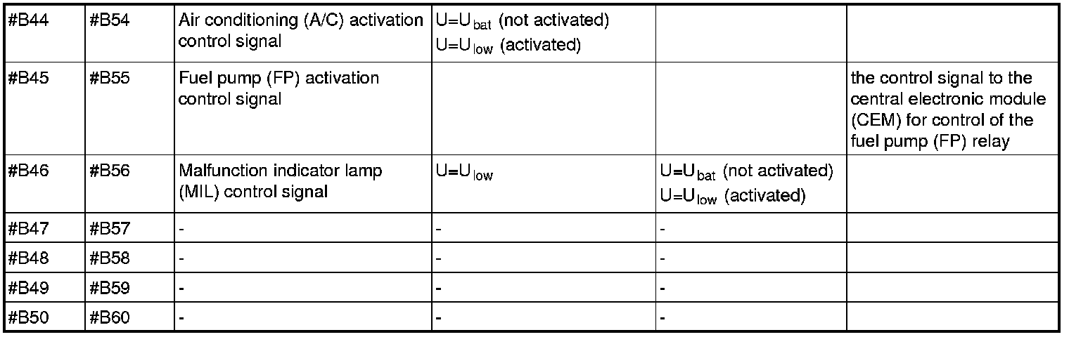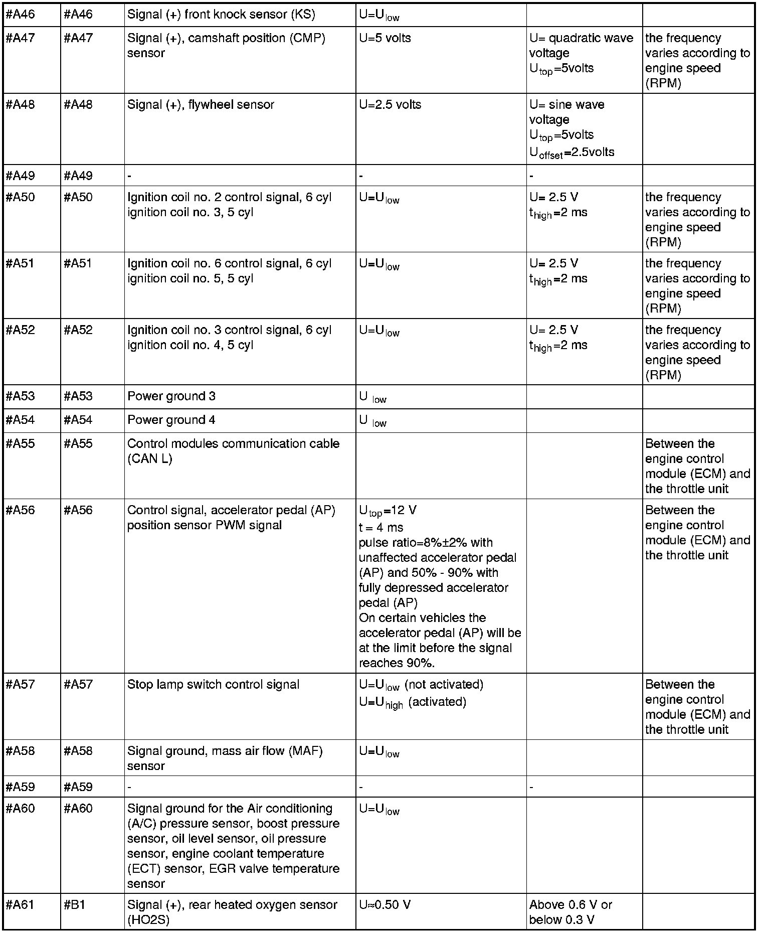 All the values given below are between the respective terminal in column 1 and terminal #B3 in column 2 (power ground) unless otherwise stated in brackets after the table entry. Control module terminals #A1-#A60 correspond to terminals #A1-#60 on the breakout box, terminals #A61-#A70 correspond to terminals #B1-#B10 on the breakout box and terminals #B1-#B50 correspond to terminals #B10-#B60 on the breakout box.