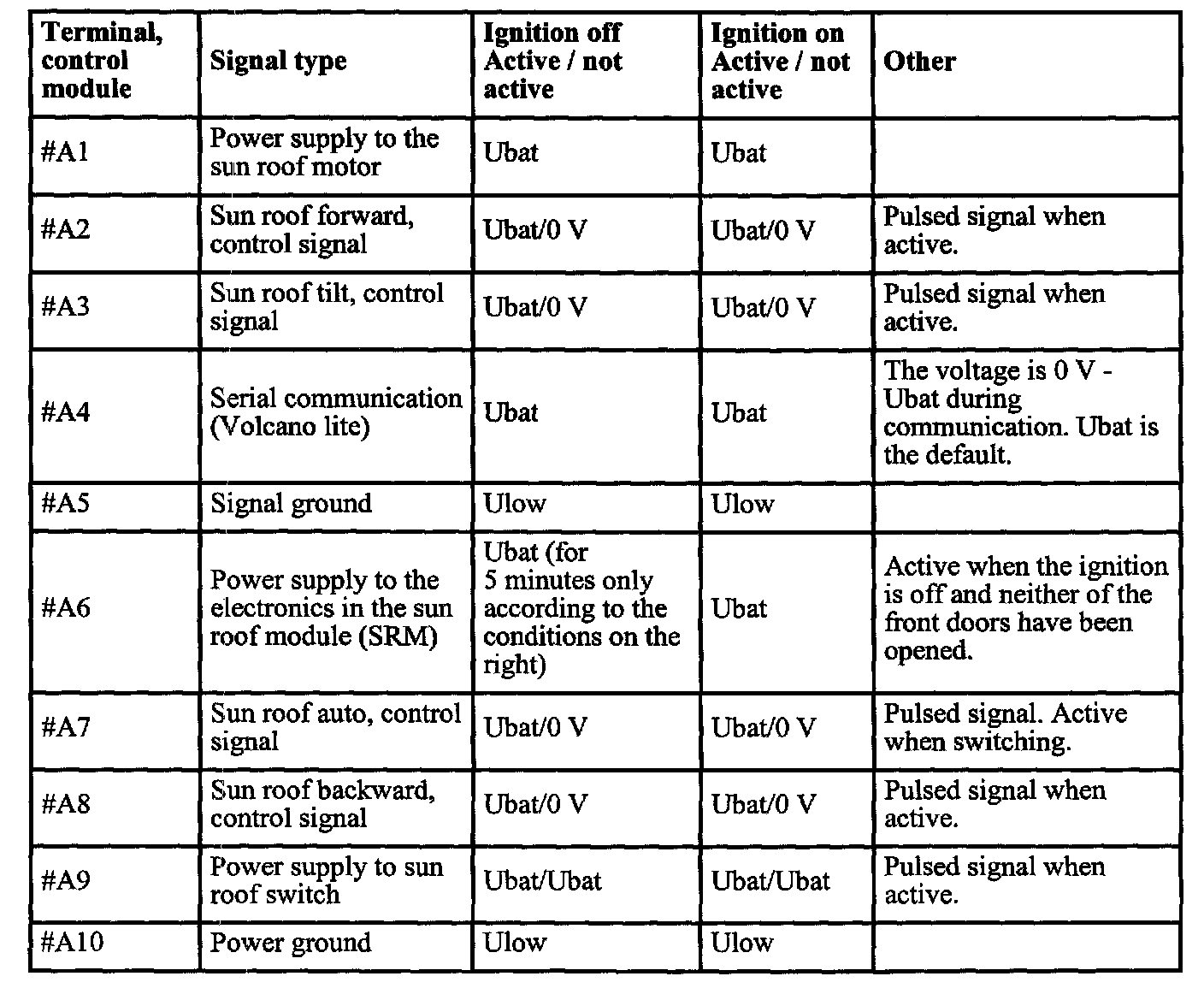 The following values are measured between the relevant terminal in column 1 and terminal # A5 (signal ground) unless otherwise stated.