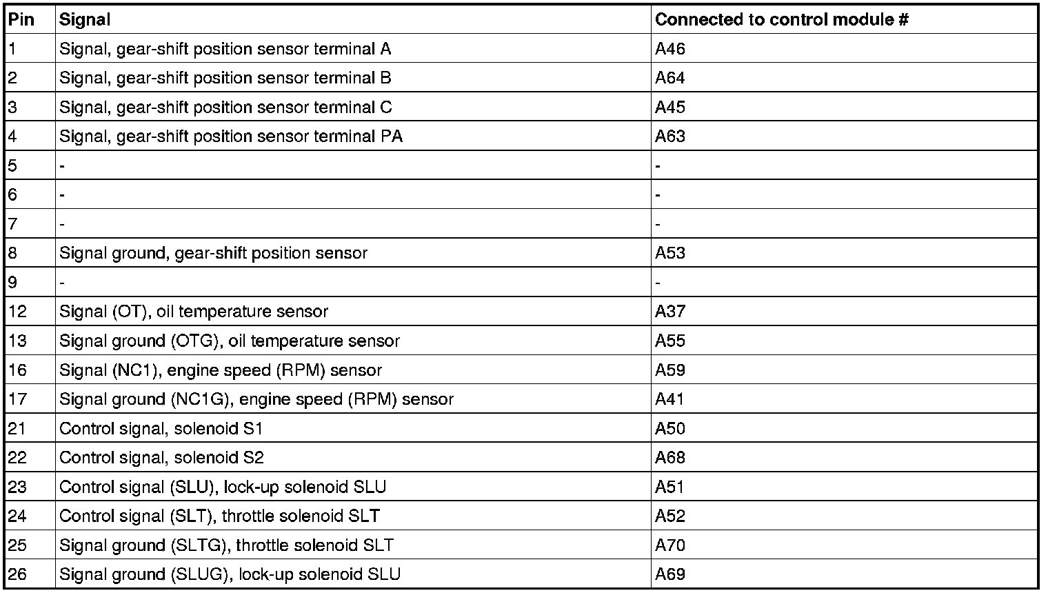 Control module terminals #A1-#A60 correspond to #A1-#A60 on the breakout box, #A61-#A70 correspond to #B1-#B10 on the breakout box.