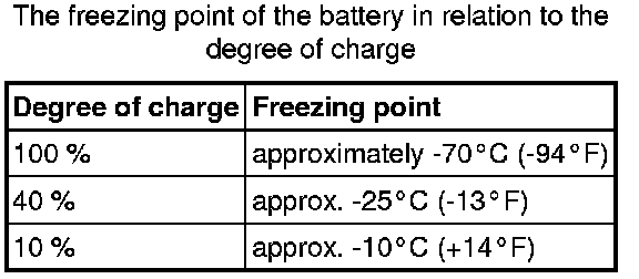 The table shows the freezing point of electrolyte in relation to the degree of charge of the battery.