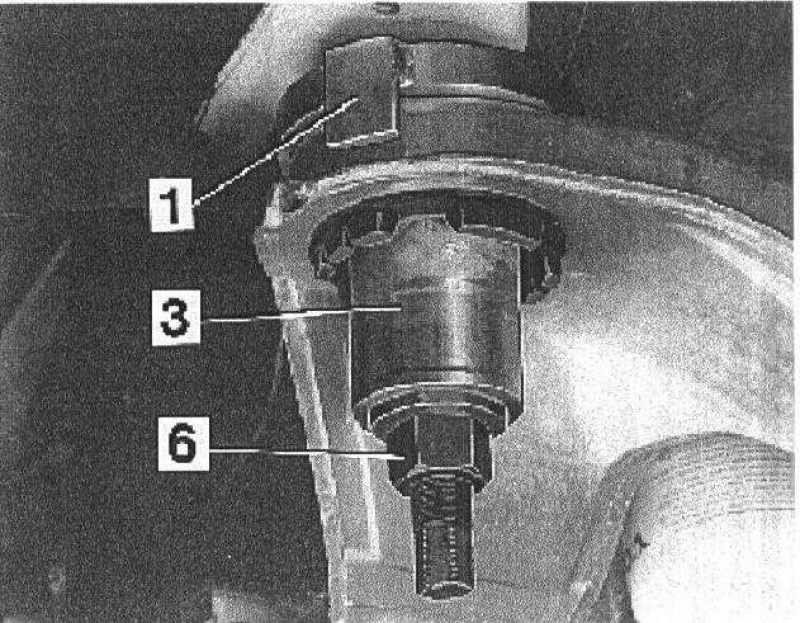Apply the drift (4) with the spikes upwards and the bushing with the rubber spikes downwards on the screw with the nut (6).