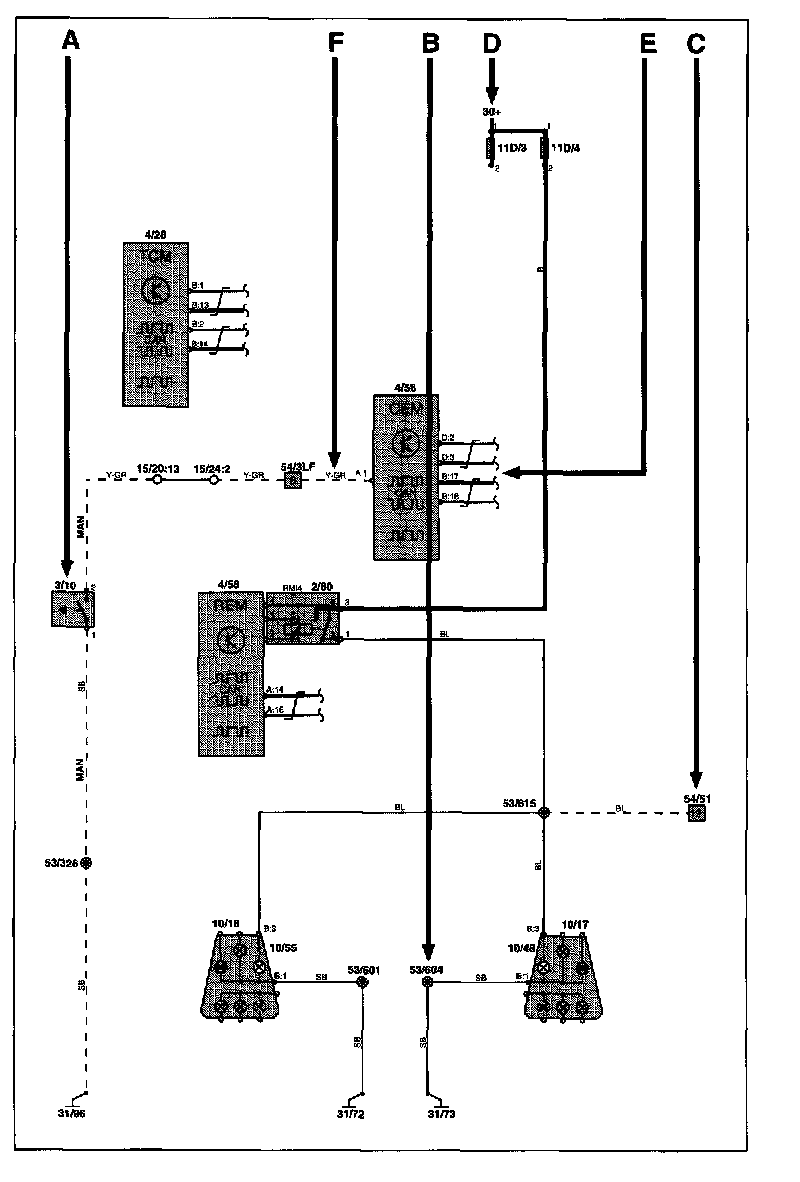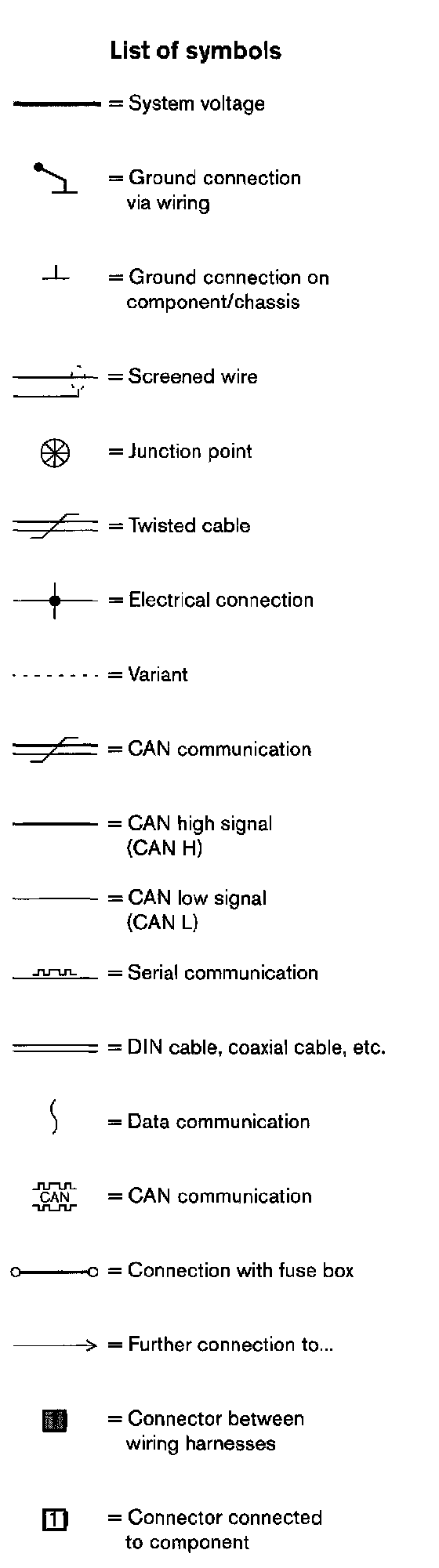 At the end of the manual is a list of components, where, with the help of the component designation, you can read off the name of the component, for example, 3/2 = Light switch. Diagram Legend