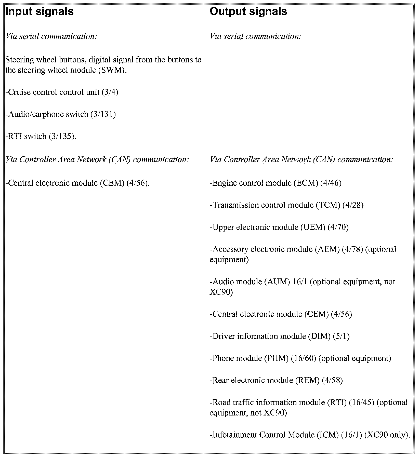The below summarizes the input signals to and output signals from the steering wheel module (SWM). The signal types are divided into directly connected signals, serial communication and Controller area network (CAN) communication. The following illustration displays the same information with the Volvo component designations.