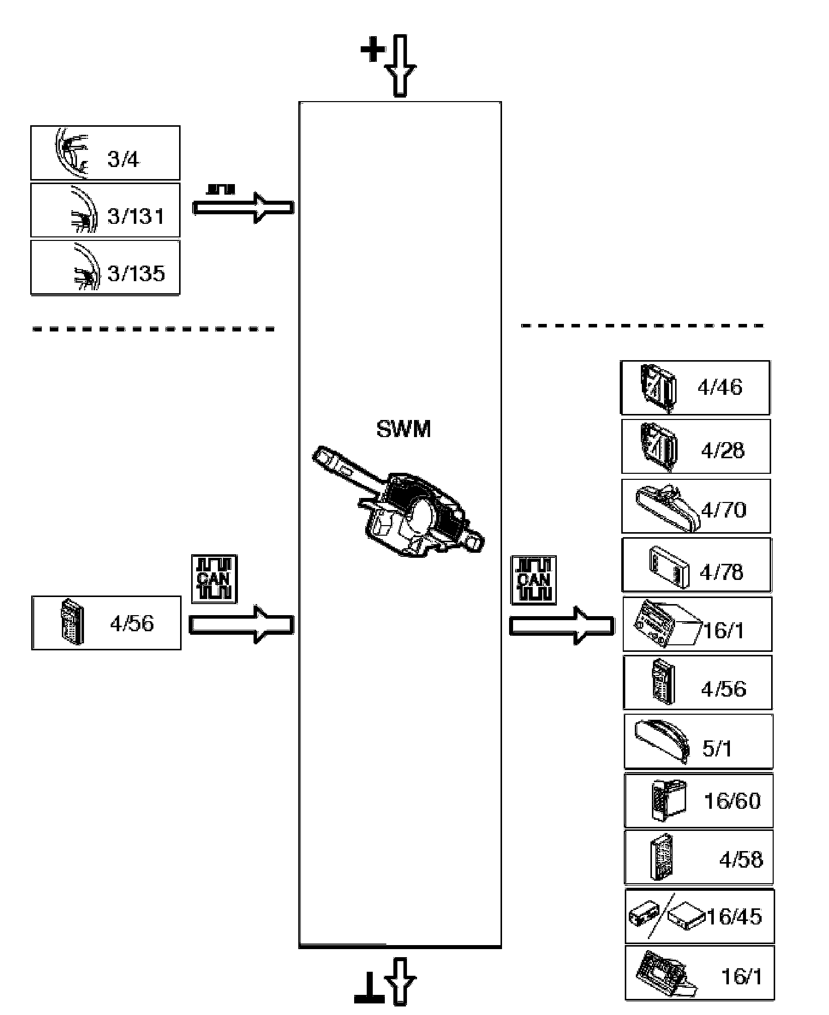 The steering wheel module (SWM) has the task of managing the signals for those functions which can be controlled via the steering wheel control stalks and buttons. The signals are transmitted to the relevant control modules via the control area network (CAN). The actual functions are not in the steering wheel module (SWM).