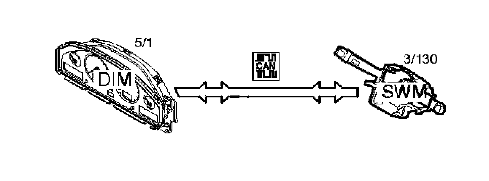 The left-hand control stalk is used to control the trip computer and to display and erase text messages in the driver information module (DIM) (5/1). The steering wheel module (SWM) (3/130) transmits information to the driver information module (DIM) on the Control area network (CAN) indicating which function is selected.
