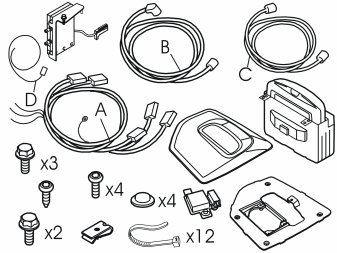 - Route the new transparent single cable (D in the kit illustration) from the lower terminal (1) for the aerial amplifier, along the existing cable harness in the rear cross member and to the rear edge of the left-hand rear wheel well