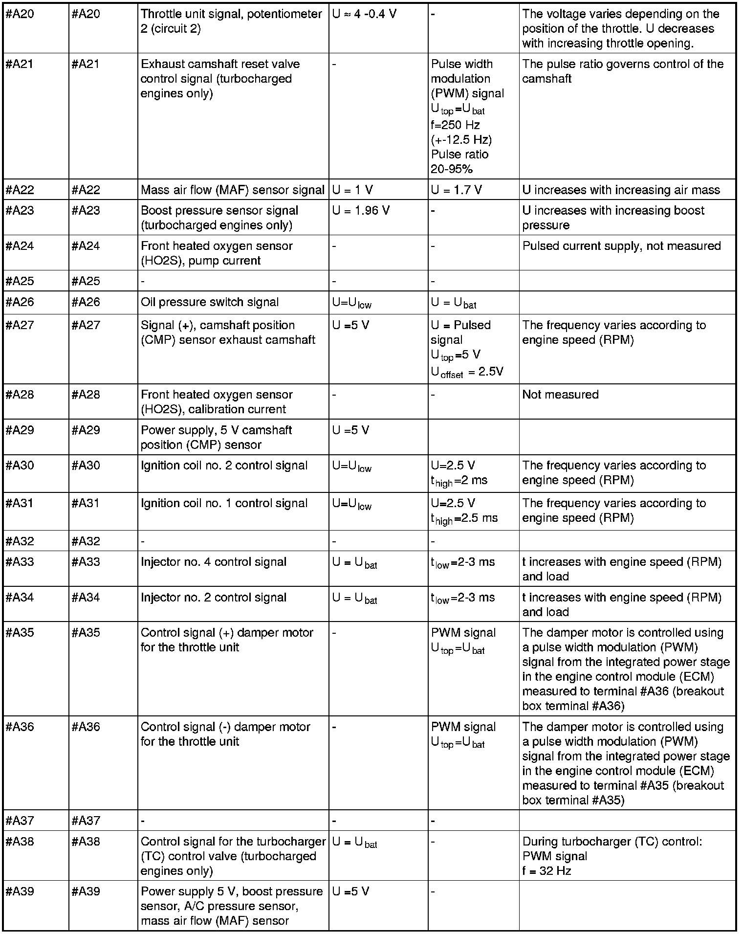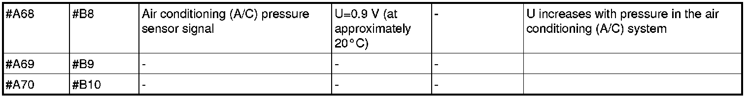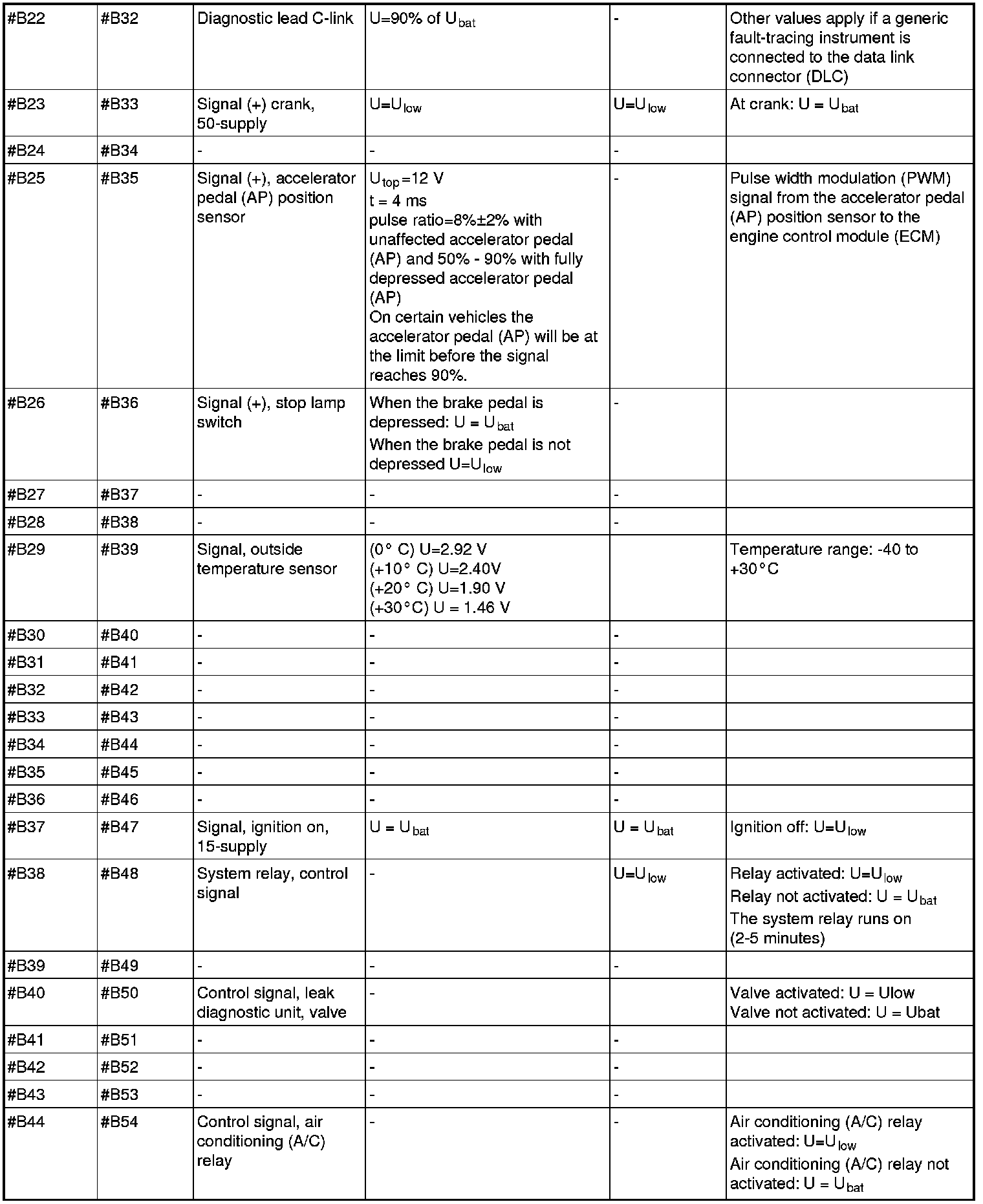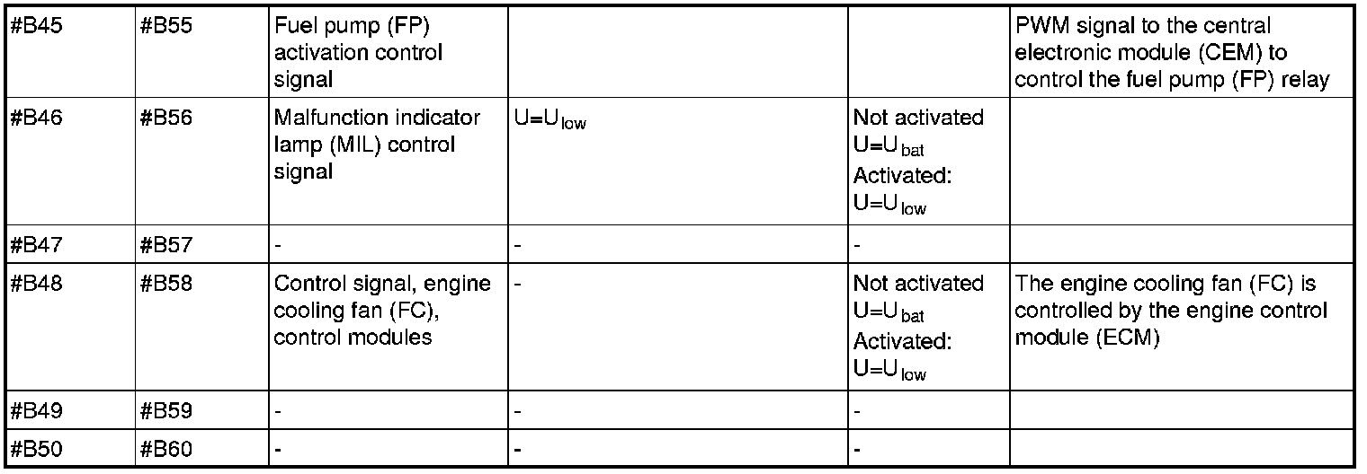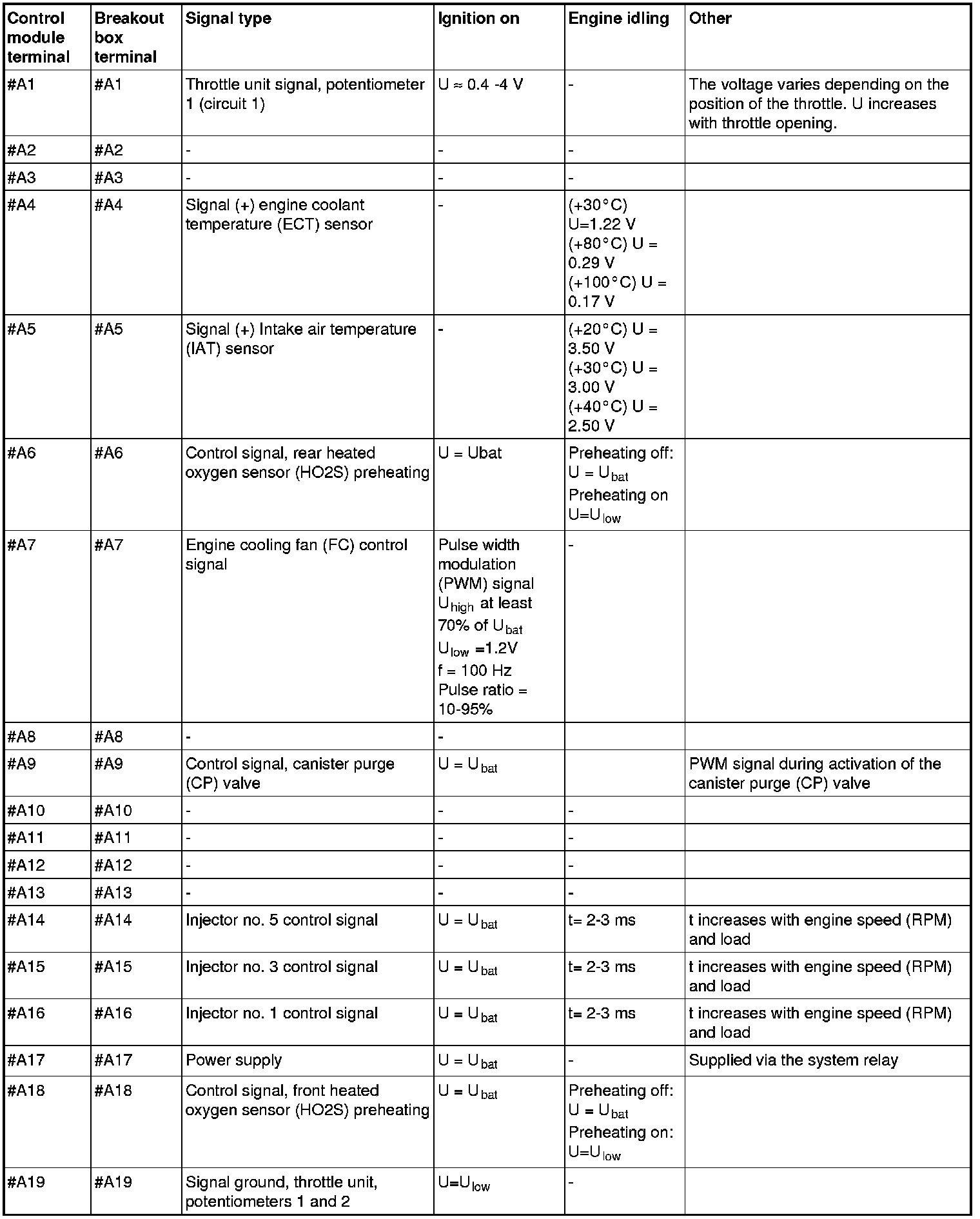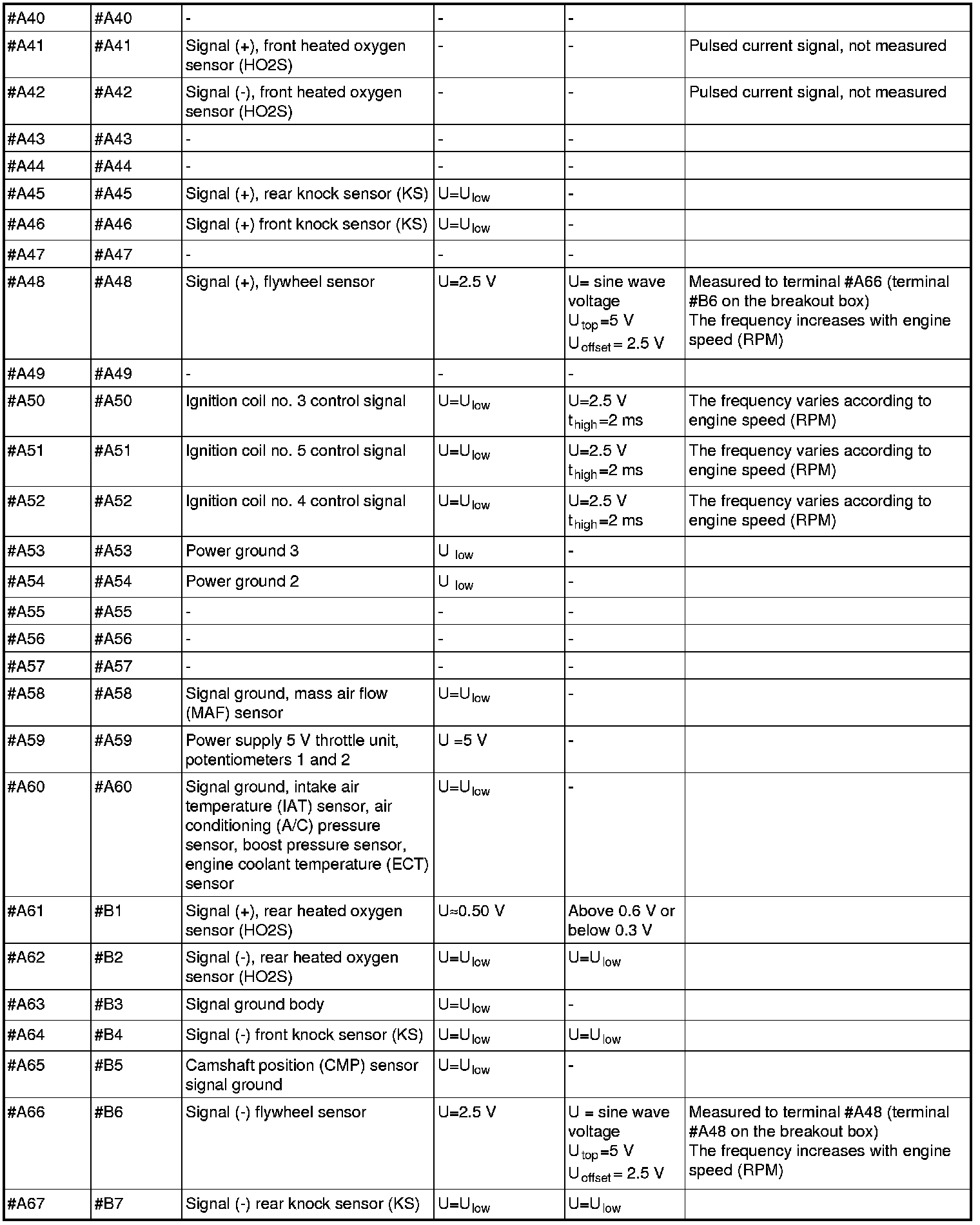 All values given below are between the terminals stated in column 1 and breakout box terminal in the control module) and terminal B3 in column 2 (terminal in the breakout box) unless otherwise indicated in column 6 (Miscellaneous).