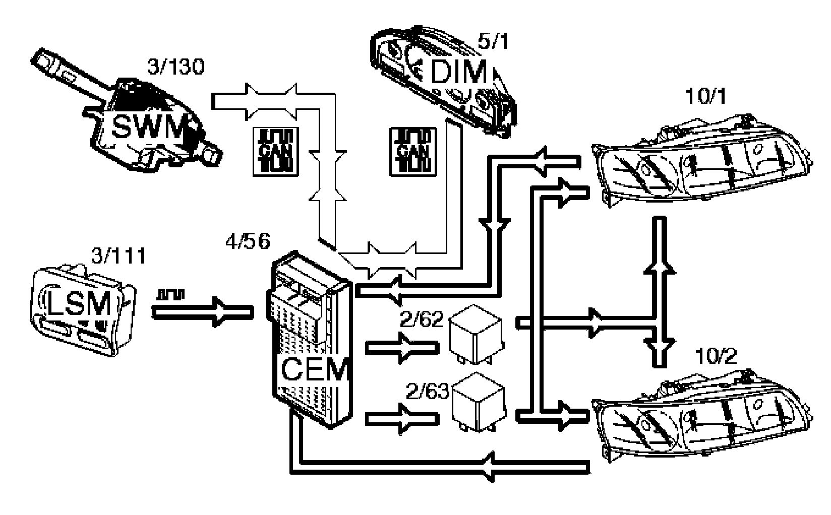 Depending on the position of the knob, the light switch module (LSM) (3/111) transmits information via serial communication to the central electronic module (CEM) to turn on low beam. The central electronic module (CEM) (4/56) then transmits a control signal to activate the low beam relay (2/62). The bulbs are then supplied with power.