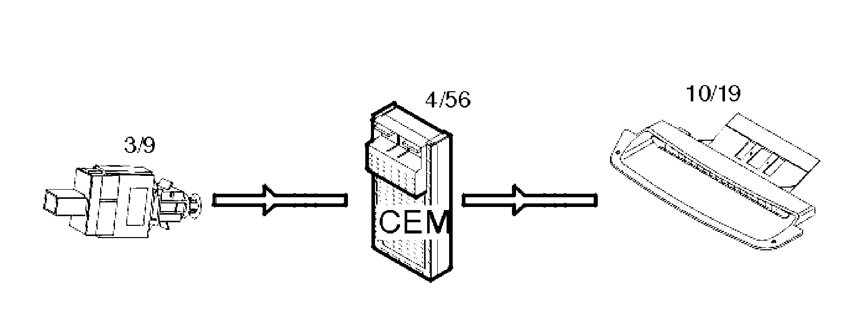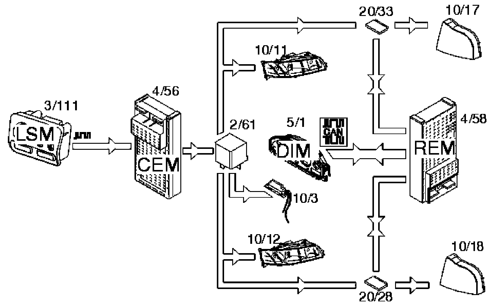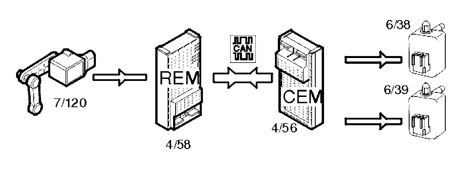 The rear electronic module (REM) transmits this data via the control area network (CAN) to the central electronic module (CEM) which compares the information with the table for the relevant model. The table is stored in the central electronic module (CEM).