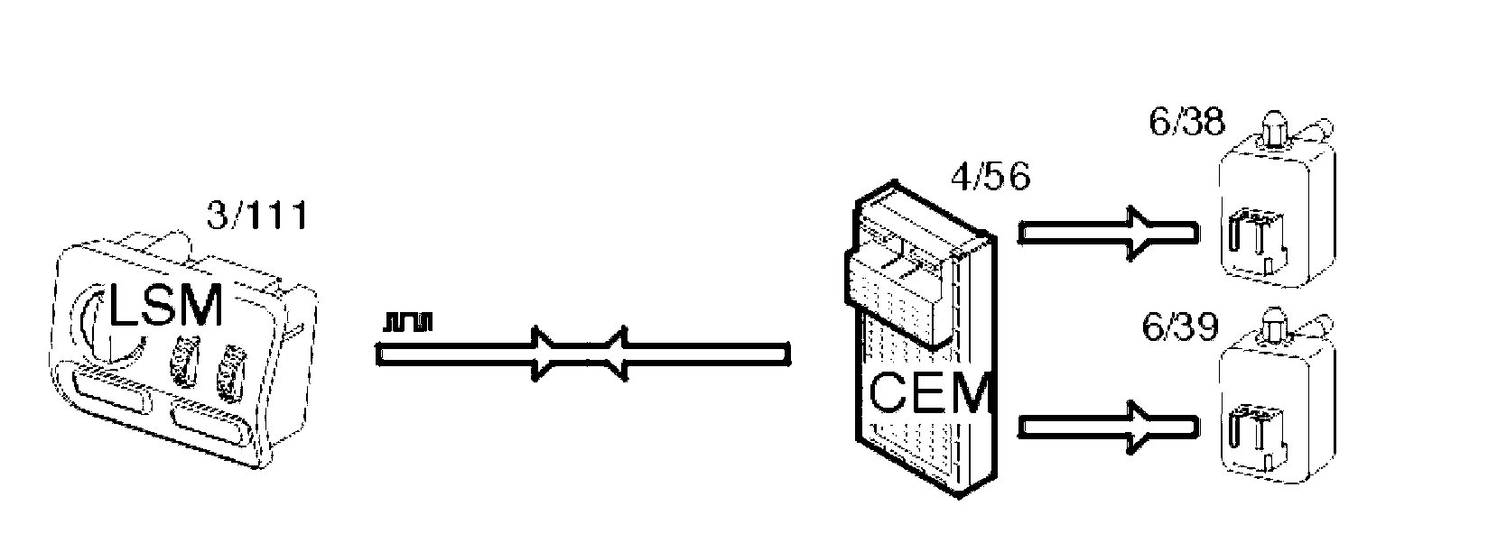 The lamp switch module (LSM) transmits data using serial communication to the central electronic module (CEM) (4/56) to activate the lamps.