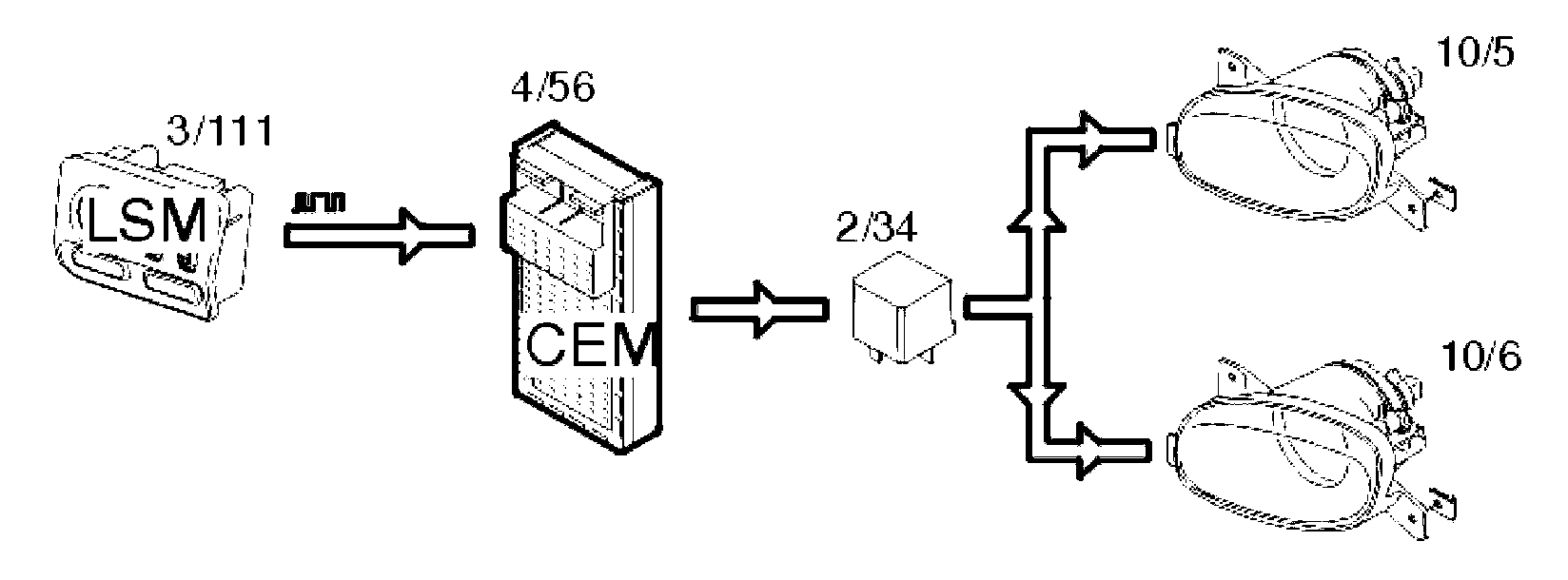 The front fog lamps (10/5-6) are activated by pressing the button for the front fog lamps in the light switch module (LSM) (3/111). The light switch module (LSM) transmits data to the central electronic module (CEM) (4/56) to light the lamps. The central electronic module (CEM) activates the relay (2/34) and the bulbs are supplied with power via the relay.