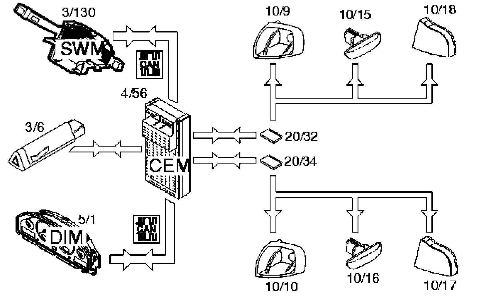 This function is controlled by the left control stalk. The steering wheel module (SWM) (3/130) sends data to the central electronic module (CEM) (4/56) to activate the turn signal lamps via the control area network (CAN). The central electronic module (CEM) transmits information to the driver information module (DIM) (5/1) to activate the turn signal indicator lamp and powers the turn signal lamp via a shunt (20/32, 20/34).